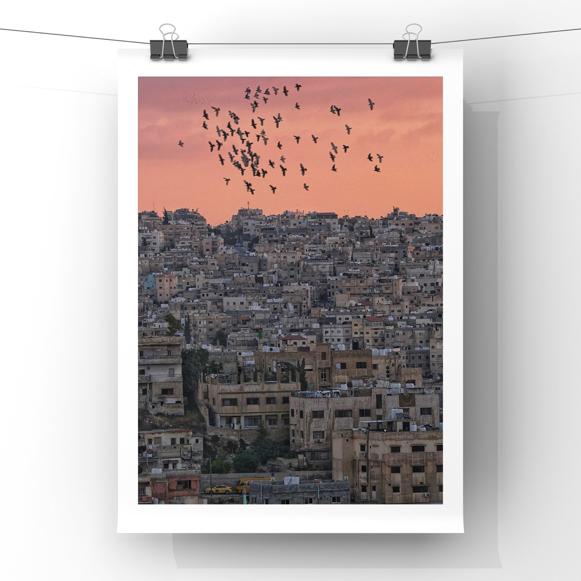 As the sun dips below the horizon, casting a warm glow over the city of Amman, a serene stillness settles over the urban landscape, leaving the scene for its flying citizens.